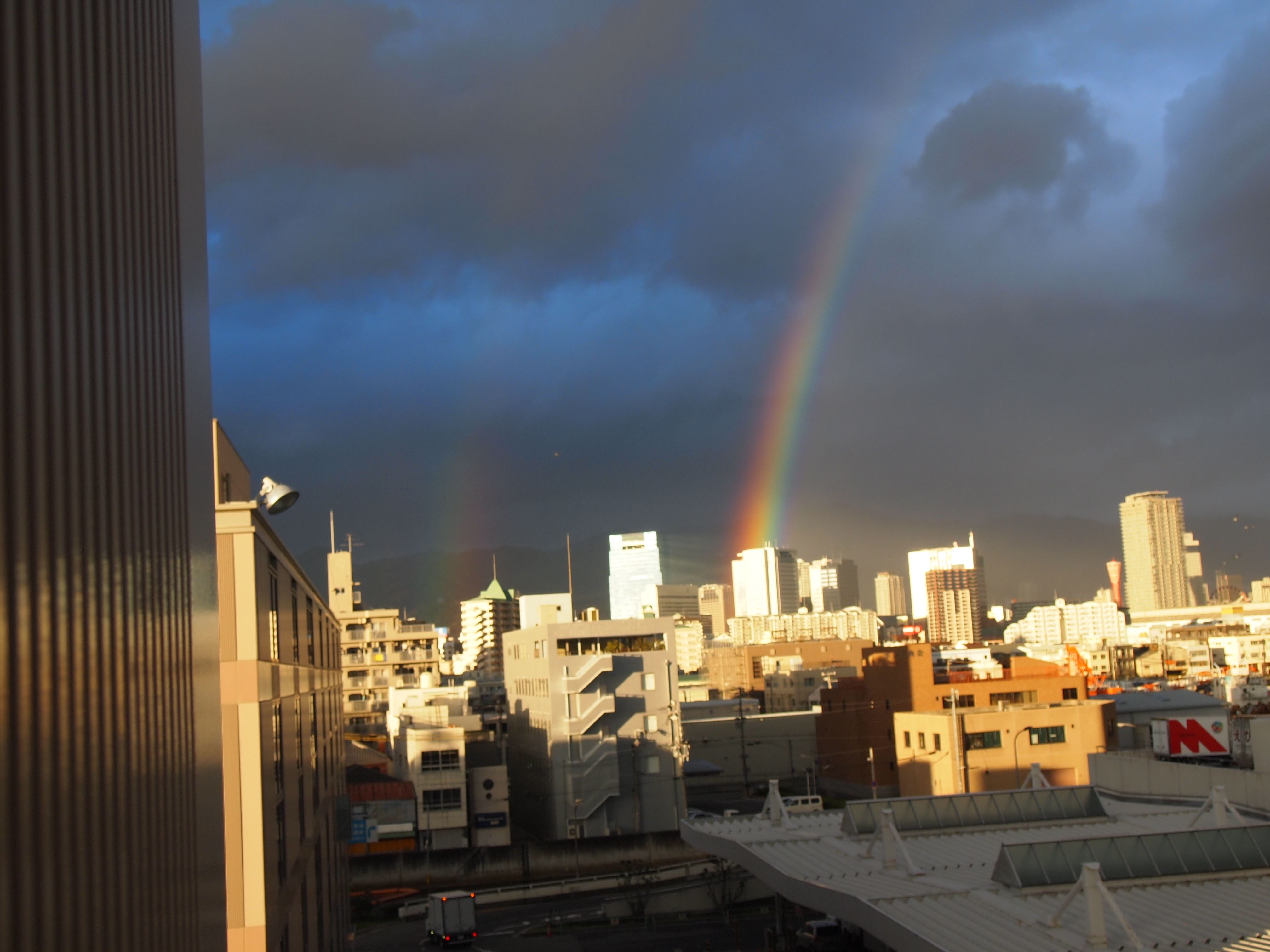 曇天の中、濃い虹が。
