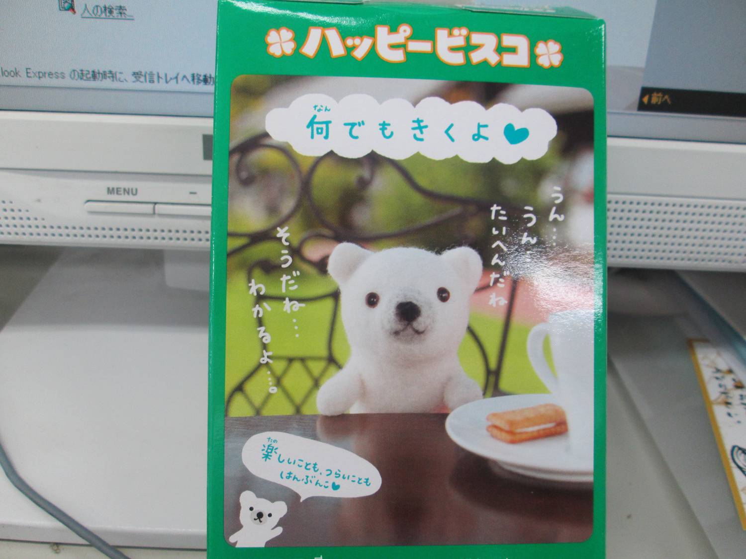 ビスコを食べながら、箱の裏の
