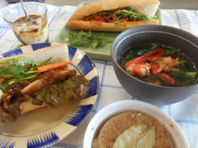 バインミーに挟む具材を3種類と干しエビと青菜のスープ、