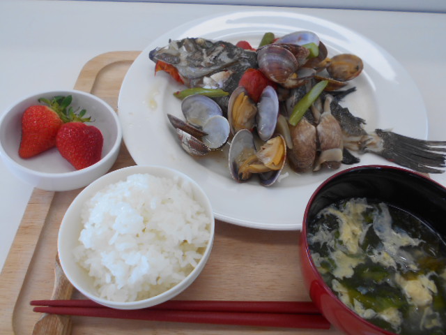 メバルのアクアパッツァ、ワカメと卵のスープ、イチゴです。