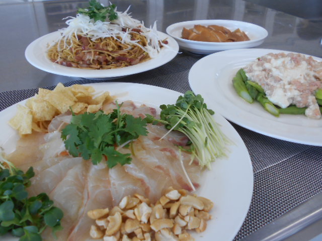 中華風の鯛の刺身、醤油鶏、焼き豚入り和えそばです。