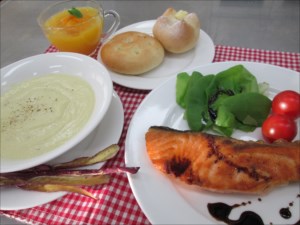 さつまいもポタージュと二層のオレンジゼリー。