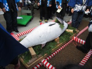 恒例の柳原神社へのマグロ奉納神輿の日です。