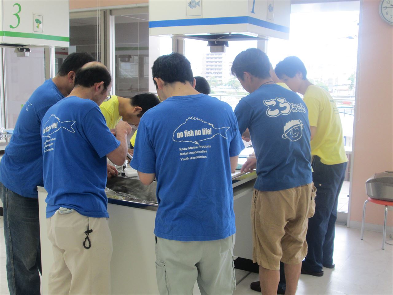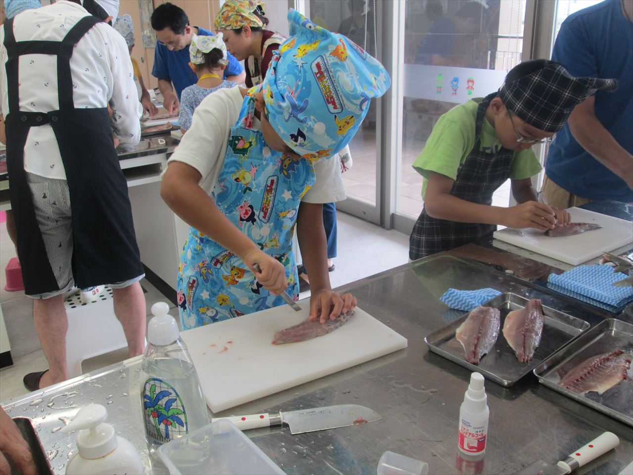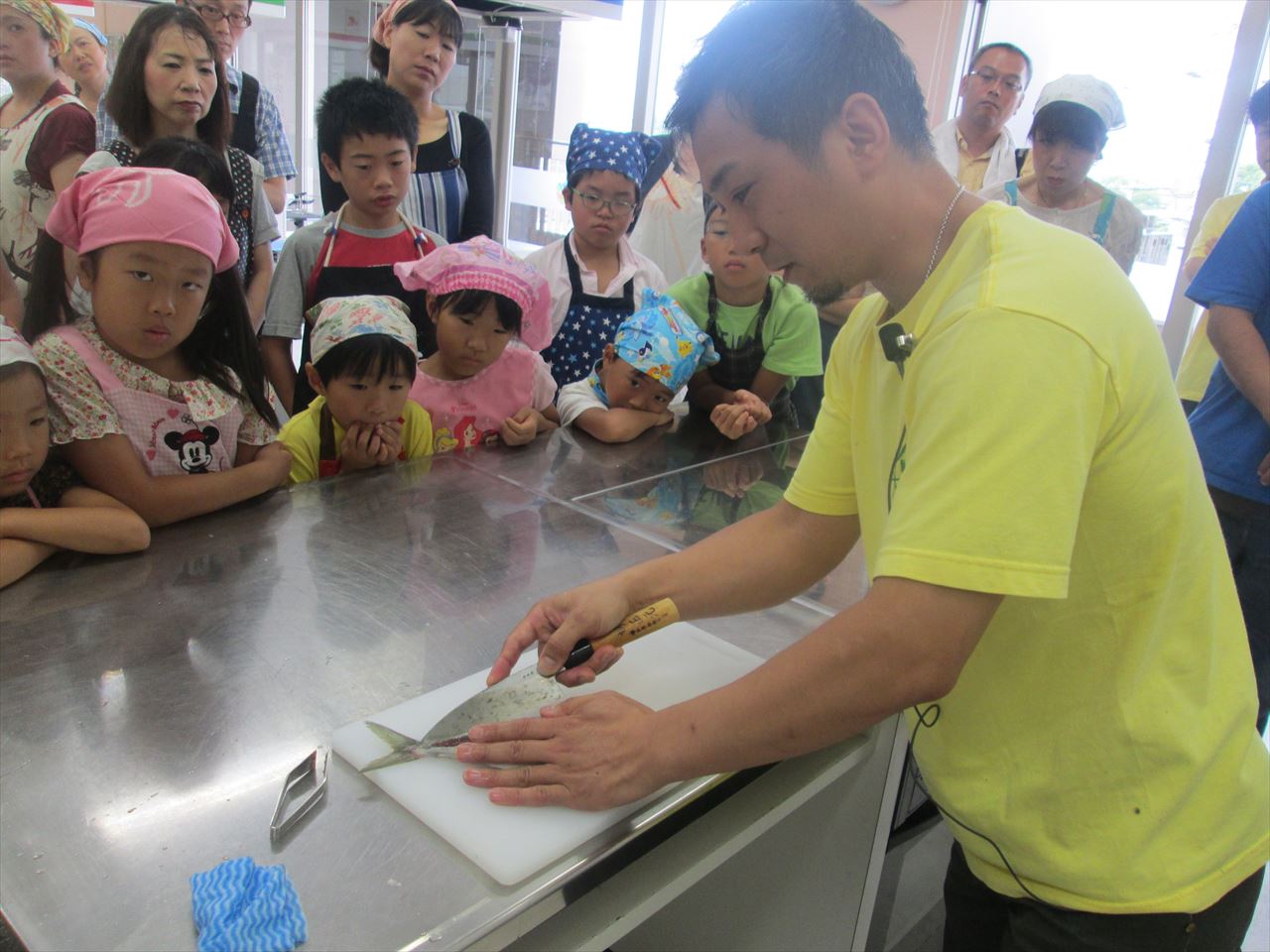 子どもたち全員で鰺の3枚おろしに挑戦。