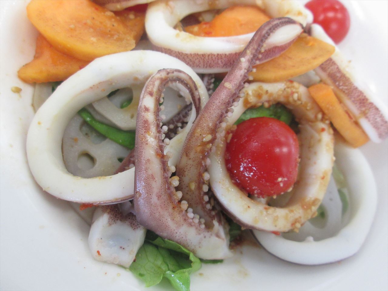 豆板醤がピリリときいた烏賊レンコンのサラダ。柿入り。