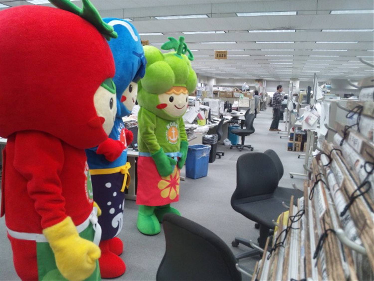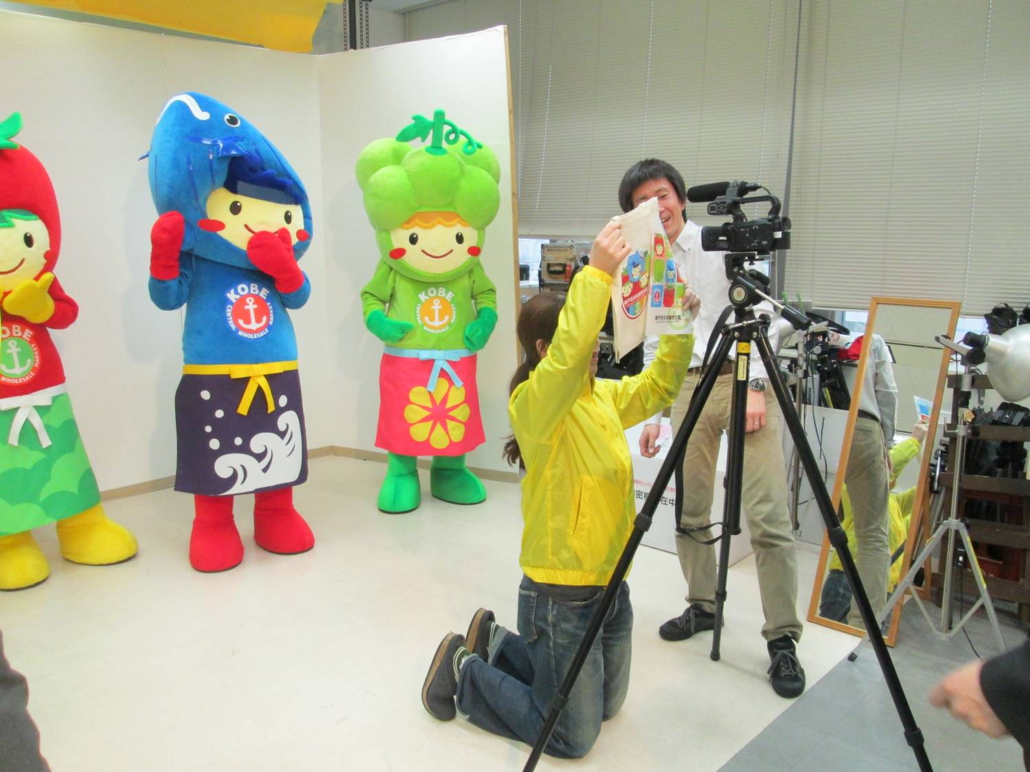 ととミー、トマティー、マスカっちょの三人が、 神戸新聞社の編集局を訪問しました。 ![]() まずは地下の駐車場で、 柔軟運動と可愛い動きの最終確認。 ![]() エレベーターは、二体乗ったらギューギューです。 (私もギューってなってブレました。) 特にととミーは顔が横長いので、どこに入るにも 一旦横向きになる必要があってタイへンです。 ようやく編集部に到着、早速記者さんから、 岩城活性化対策委員長、山本副i委員長、美人の I 課長が、 取材を受けました。 ![]() ととミーたちにも椅子を用意してくれましたが、 体型的に座るのが困難なので立ったまま、 お利口さんに取材を見守っておりました。 今度は、隣のスタジオに移動して ![]() まずは動画を撮影しました。 キャラクターの三人は、構造上寡黙なので、 山本副委員長の出番となり、 セリフを急遽考えたとも思えない すばらしい出来映えで動画撮影終了。 途中、動きの堅い新人マスカっちょが、 I 課長の厳しい演技指導に泣きそうになりましたが、 がんばりました。 出来上がった動画はコチラ ![]() そして最後に新聞記事用の写真を撮影して 今日の任務はおしまい。 なんやかんやで、編集部さんに 結構長時間お邪魔しておりました。 今日の神戸新聞に汗と涙の記事が掲載されてま~す。 読んだ方は、この記事になるまでに いろんなことあったのだろうと 察していただきながら、ご覧ください。 |