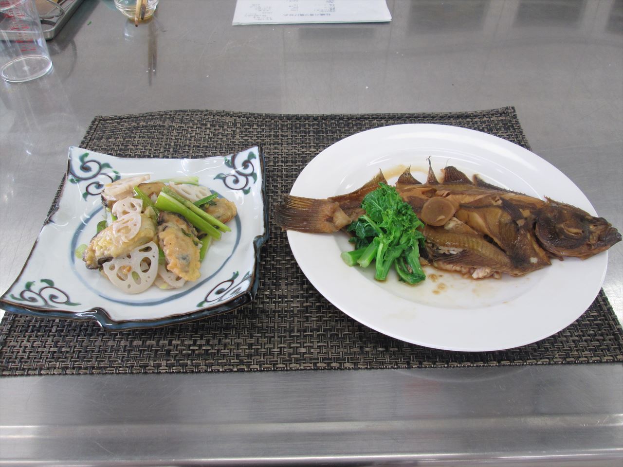 カレイの煮つけと牡蠣の香り揚げ炒め
