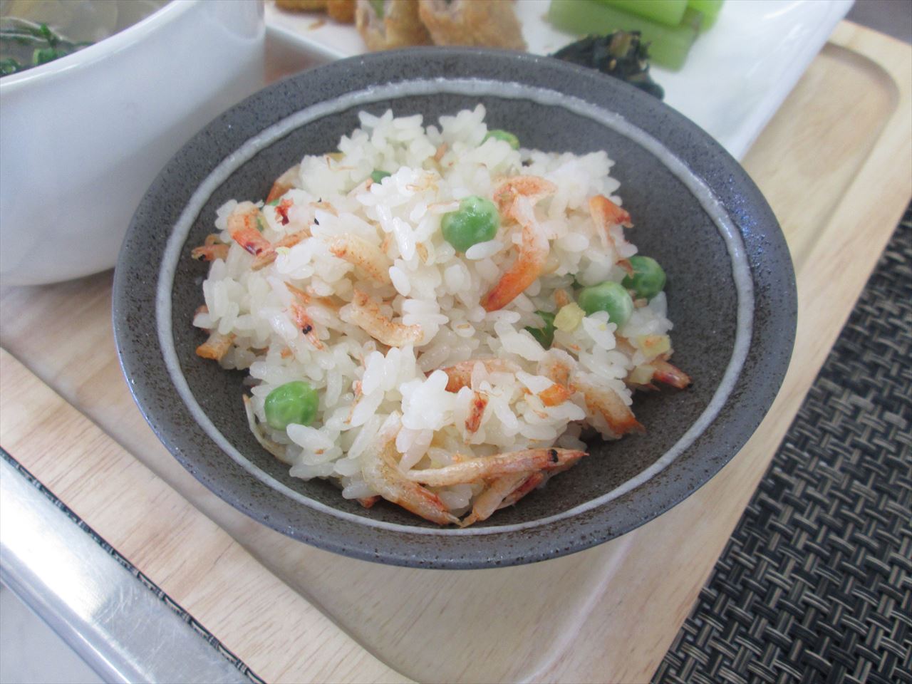 桜海老とうすいえんどうを使った炊き込みご飯。